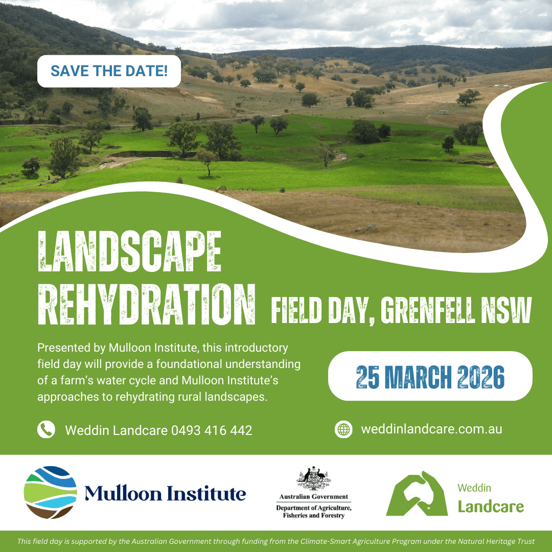 Mulloon Institute will be running a Landscape Rehydration Field Day in Grenfell on Wednesday 25th March 2026. Registrations for this will open soon.